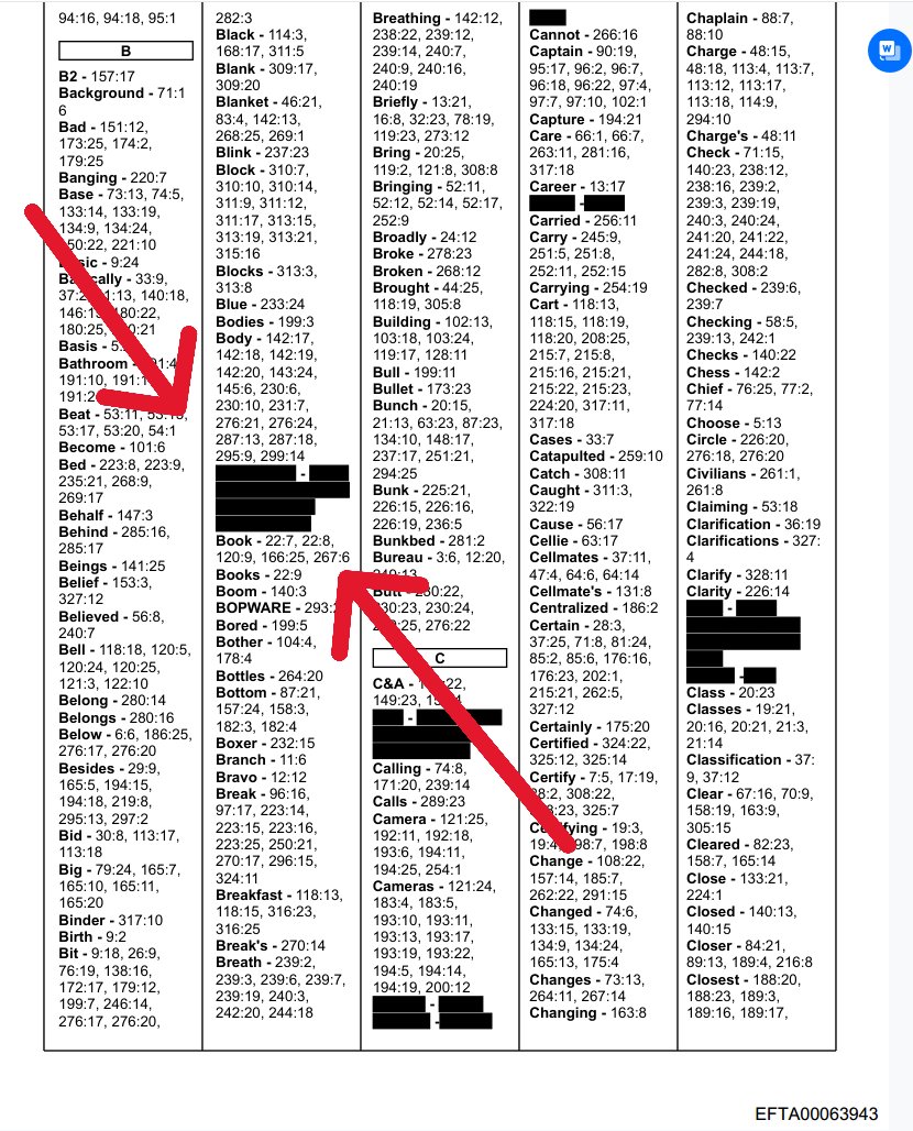 Guess what happens when you go to page 56 line 14? It says "if I mispronounce the name" because Ghitto Bonhomme is an unusual name to most English-speaking Americans. Also, they are going down the list of guards, and IT IS REDACTED. This means DOJ forgot to redact the index.