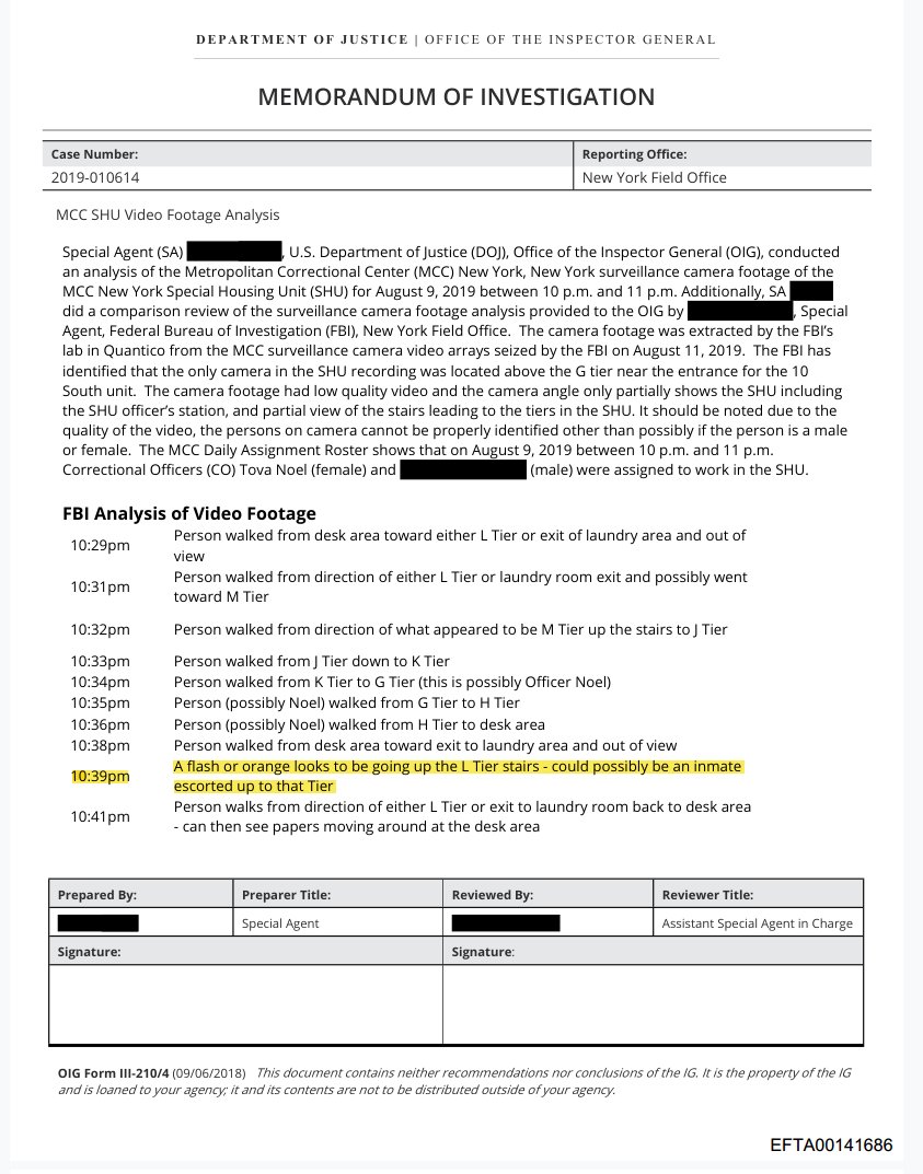Notably, the FBI disagreed with the OIG that it was in fact a guard. They are in the wrong clothing, they are going up 39 minutes after lights out for an incomprehensible reason, and guess what else? Noel was so lazy she did NONE of the counts after 10:00 p.m. on August 9th,