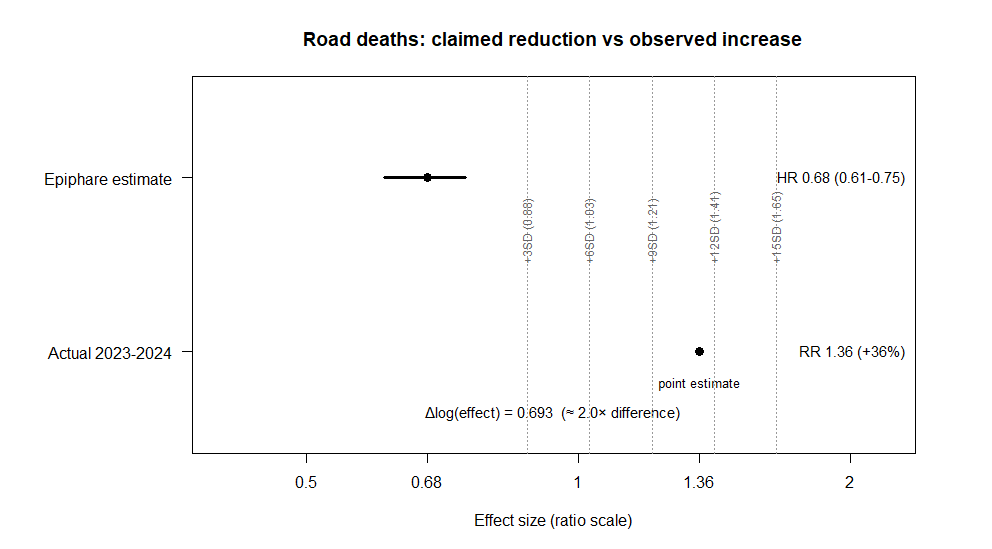 What this shows is that the Aus real-life value is is over 10 sigma outside Epiphare's own upper estimate of the miraculous "risk reduction for car crashes"