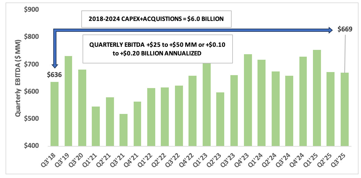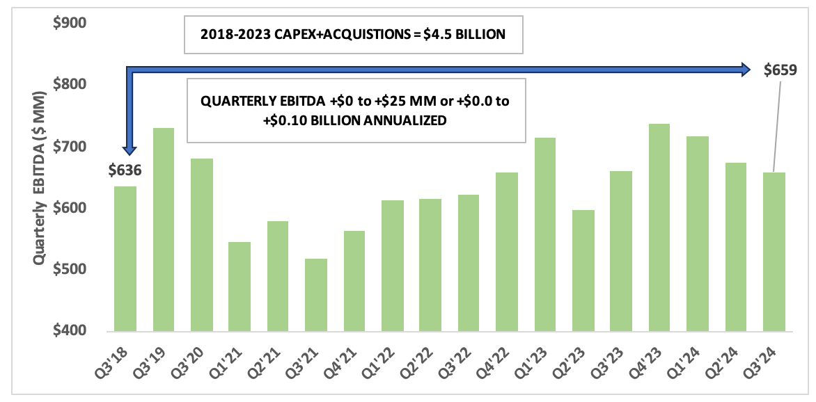 For return on capital deployed I took the change in EBITDA between Q3'23 and Q3'18 and annualized the change