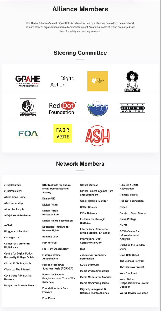 “Steering Committee members of the Global Alliance Against Digital Hate and Extremism are Avaaz, Digital Action, Equality Labs, Faith Matters, Global Project Against Hate and Extremism, and The NEVER AGAIN Association.”