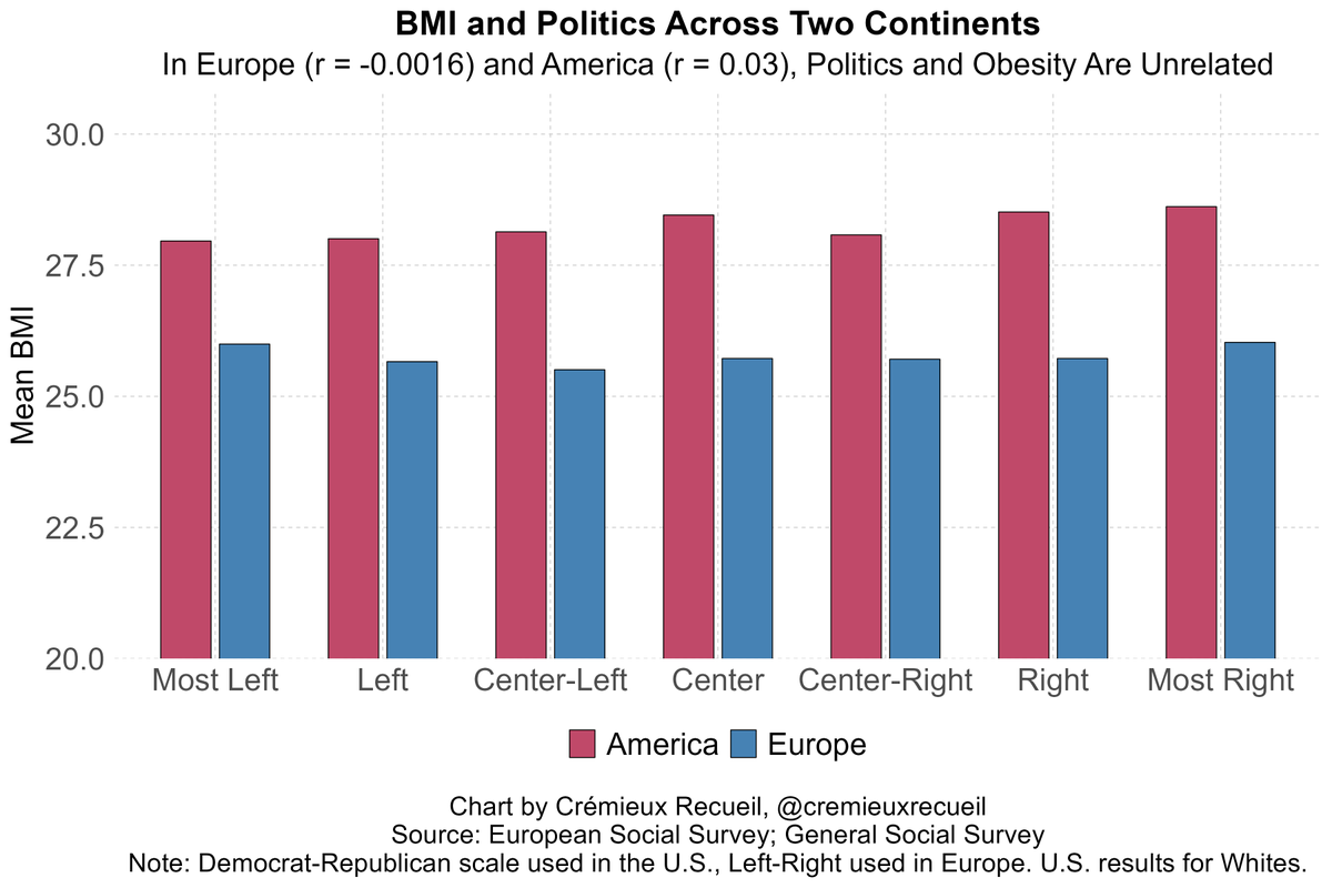 Among individuals, political identification and obesity are unrelated in the U.S. and Europe. Image