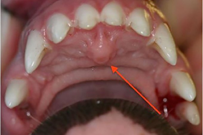 The tip of your tongue should rest on the incisive papilla (picture below). It should not be pushing on your front teeth.