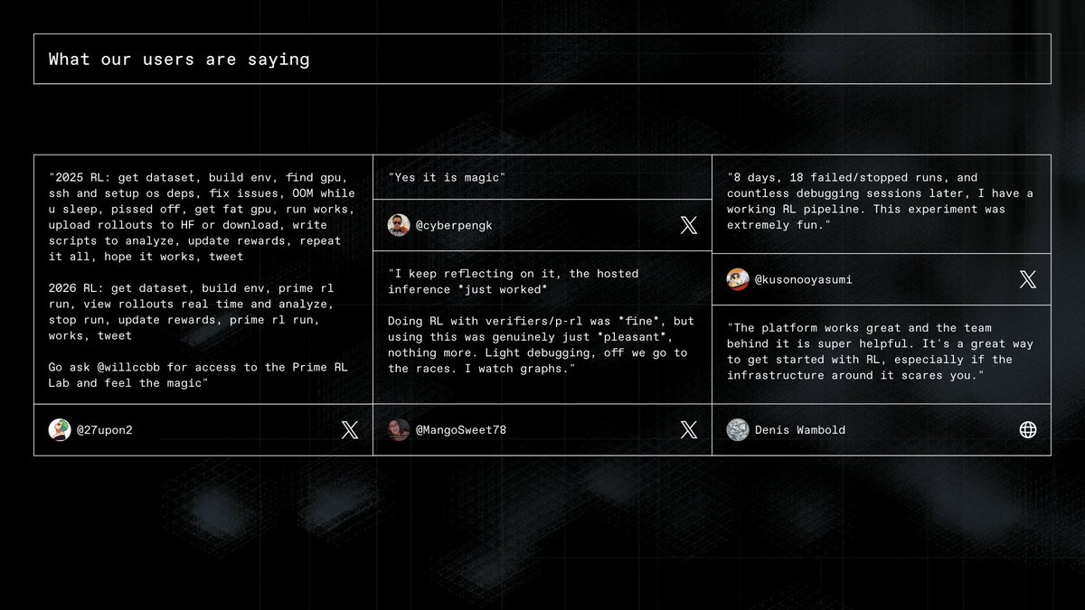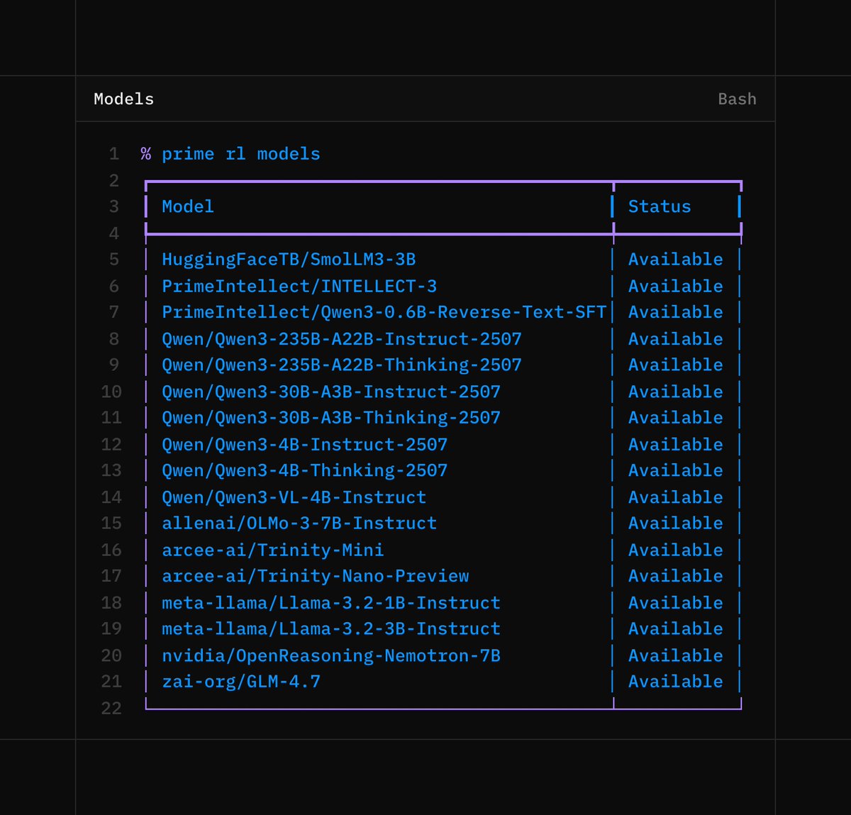 - Native integrations into our full-stack infra offering: Environment Hub, Sandboxes, Reinforcement Fine-Tuning, Multi-Node Training