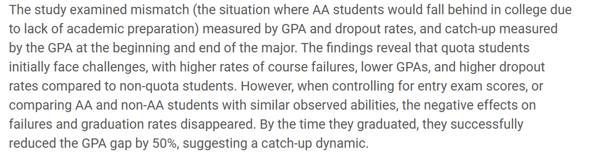 In college, affirmative action admits of course do worse than their non-affirmative action admit peers, however this gap disappears if you control for measured ability [lol].