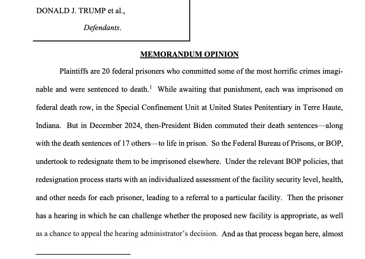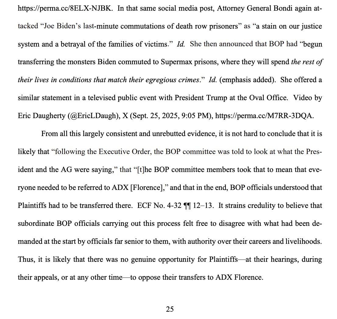 JUST IN: Judge Kelly has barred the Trump administration from transfering 20 former death row inmates (commuted to life sentences by Biden) to the notorious ADX supermax prison, saying they were given "sham" due process after decision was made. ecf.dcd.uscourts.gov/cgi-bin/show_p…