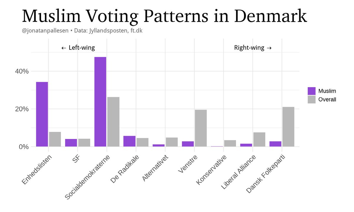 More than 30% of Muslims support a party that is extreme in its support for socialism, even for Denmark (Enhedslisten). Image