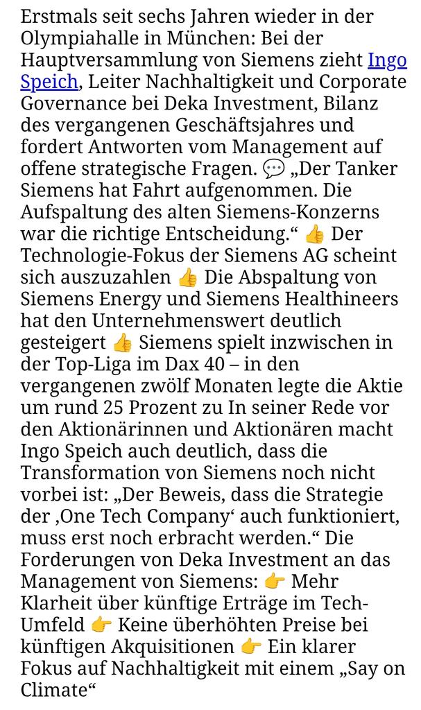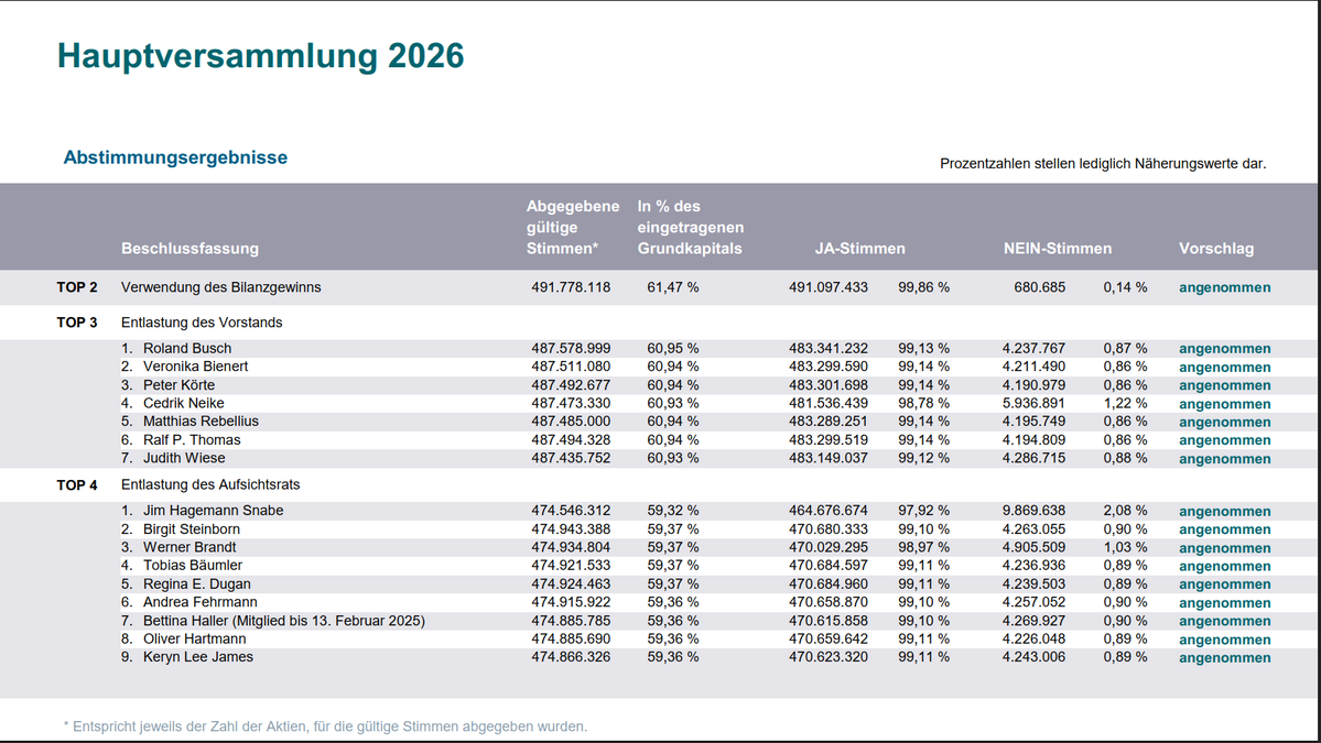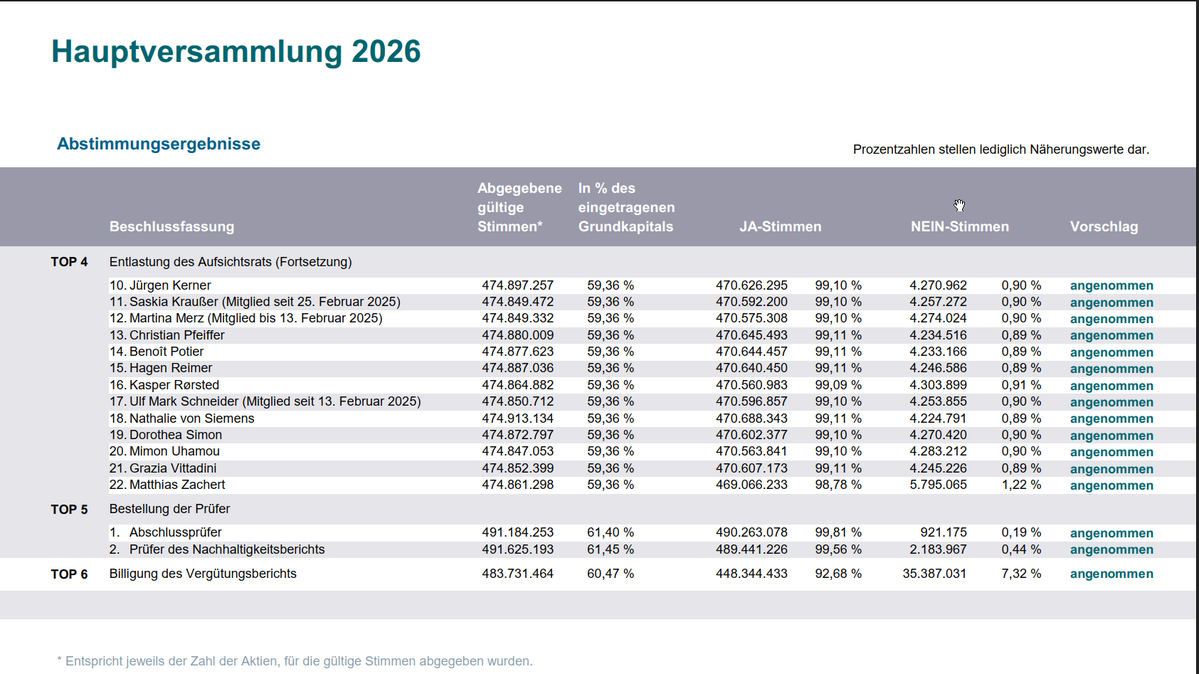 Leider wurde TOP 9 (Ermächtigung für 5 Jahre vHVs) angenommen. Ich befürchte, dass Siemens hiervon reichlich Gebrauch machen wird. 😢