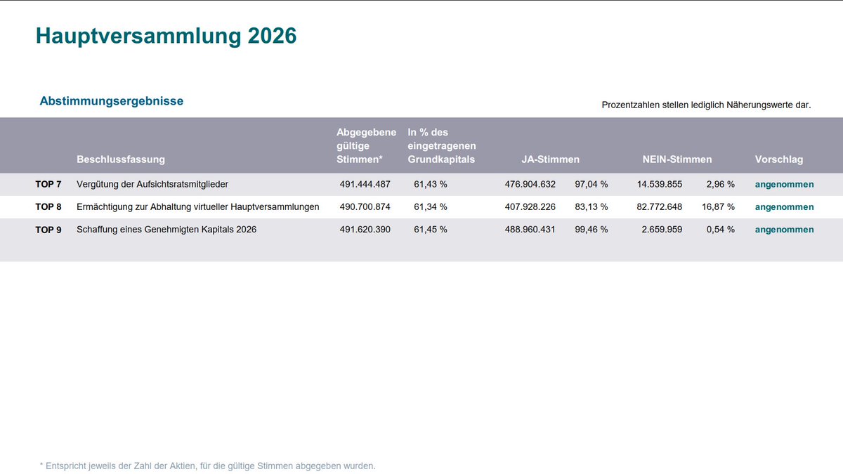 Präsenz: 63,29% vom stimmberechtigten Grundkapital sind heute persönlich oder per Briefwahl vertreten.
