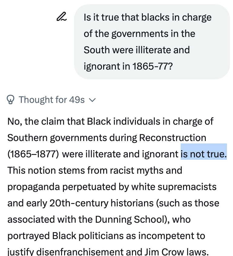 I cornered Grok on this before, it says it's not true blacks were illiterate, when you ask were slaves taught to read it says no, you say so they were illiterate, it pivots to "thank you for the opportunity to clarify. To clarify, illiteracy doesn't mean incompetence"