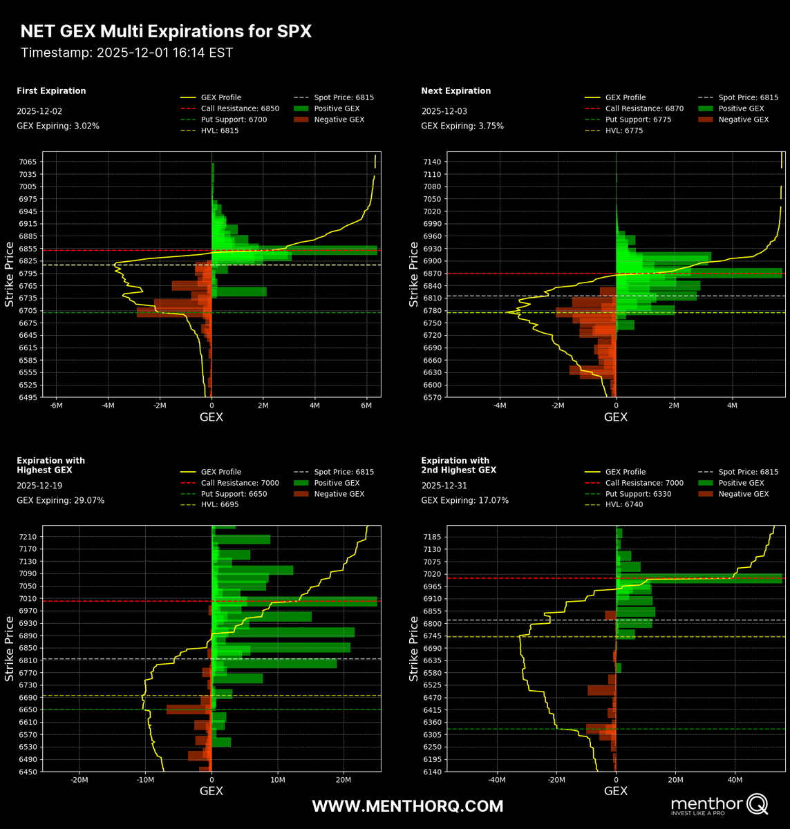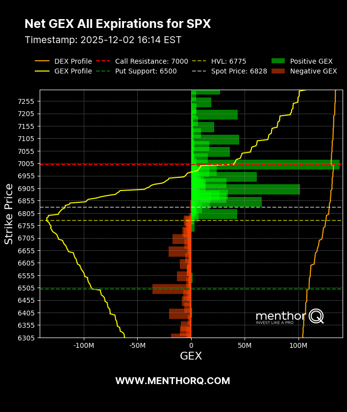 $SPX sits around 6,815, and today’s GEX landscape shows a market that’s tightly pinned between heavy call resistance above and layered put support below.