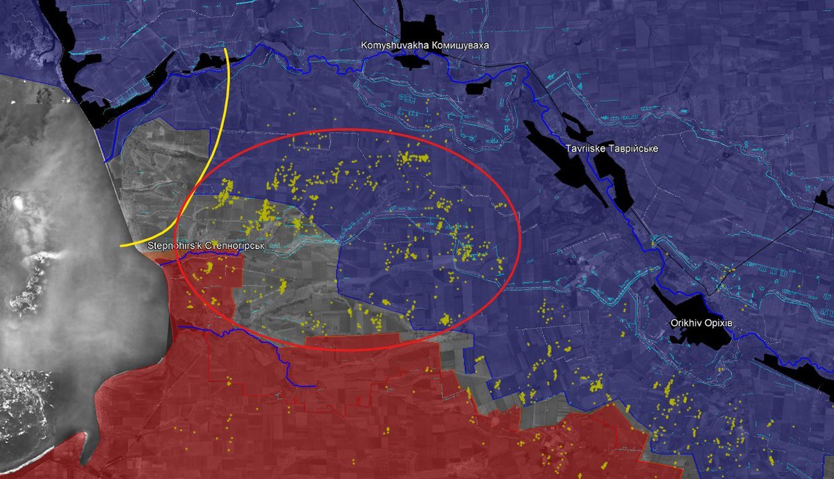 As I showed last week, airstrikes suggest Russia is pushing to Komyshuvakha and Tavriiske, behind Orikhiv.
