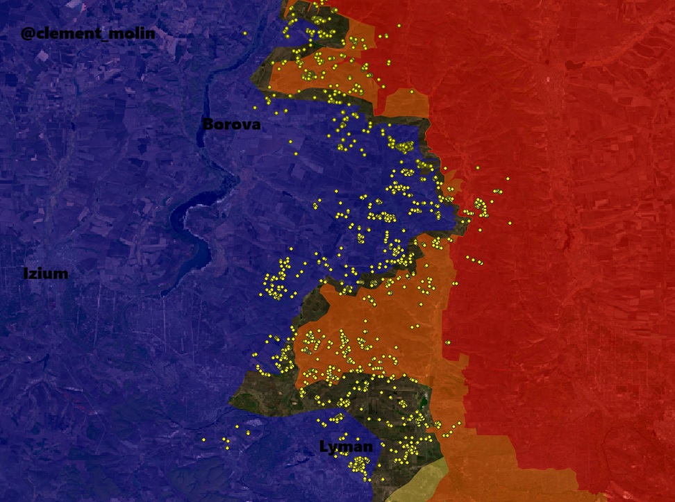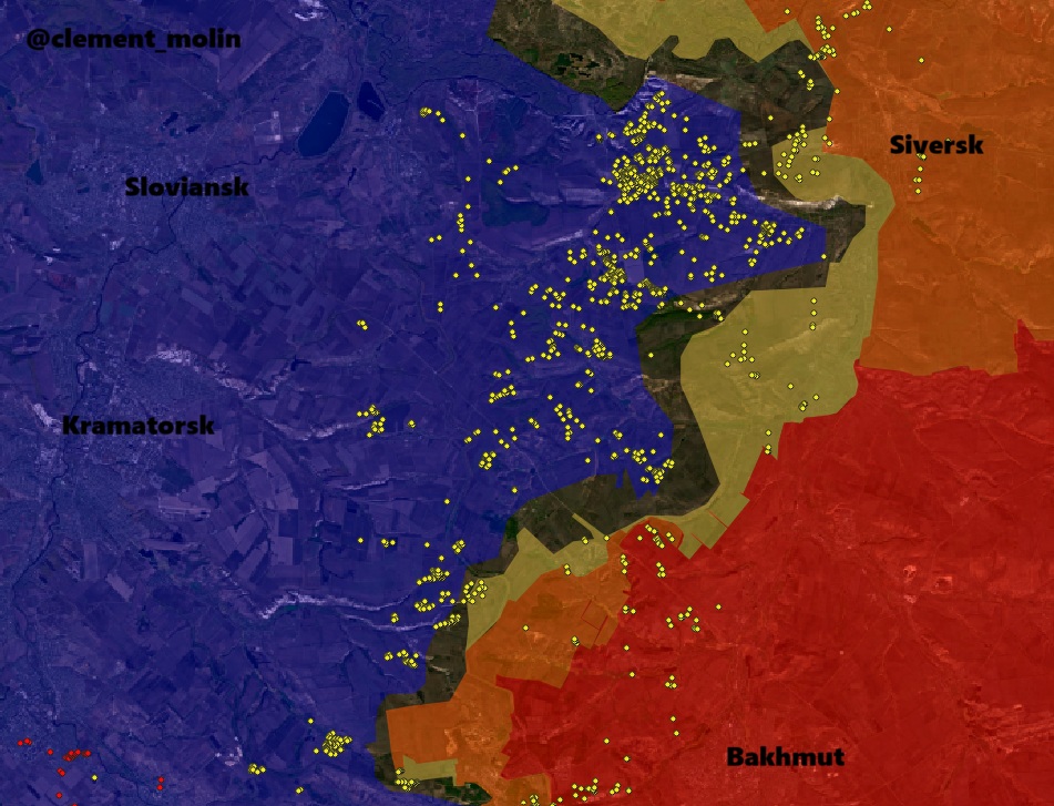 Not much activity on Kramatorsk direction, but a lot of shelling just west of Siversk. (no data for the area between Lyman and Siversk, forest, impossible to map).