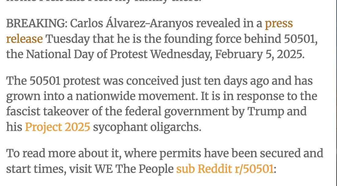 Anyway, Carlos Γlvarez-Aranyos created the PAC just two days after u/Evolved_Fungi created r/50501.