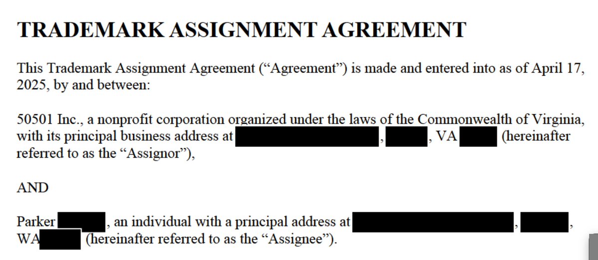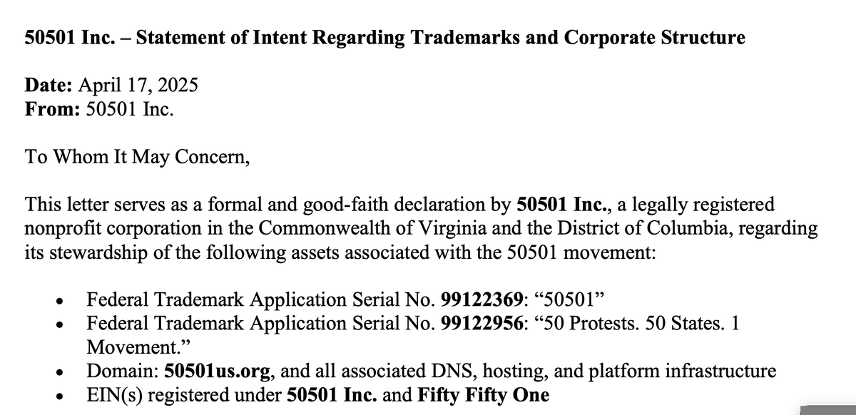 Parker, an ally of u/Evolved_Fungi (who created 50501) reports he was pressured to reassign trademarks to an outside entity (50501 Inc.). The original founders on Reddit also report pressure to abandon the nonprofit.