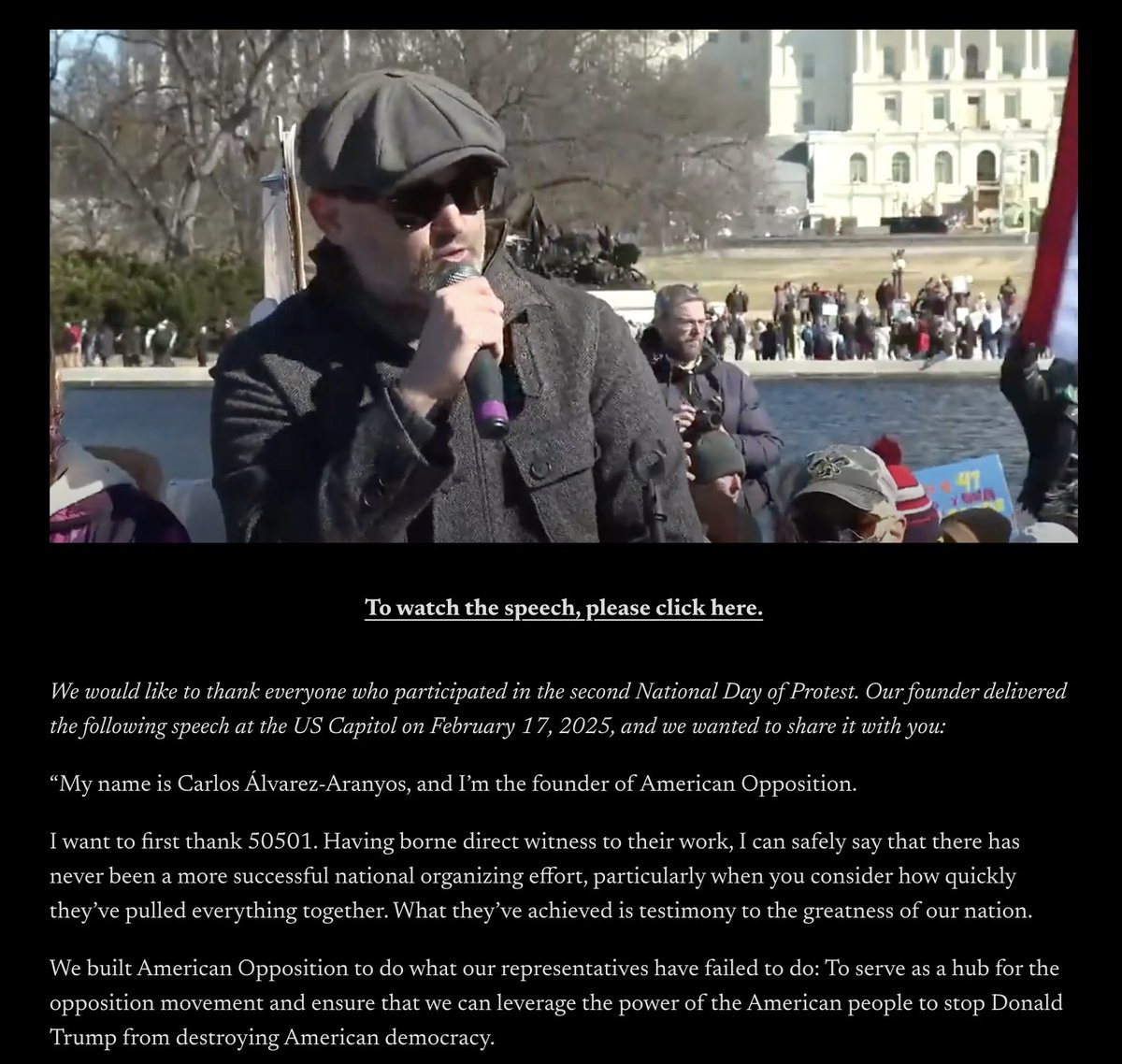 On January 27, 2025, Carlos Γlvarez-Aranyos registers American Opposition Super PAC with FEC, 9 days before 50501's first protest.