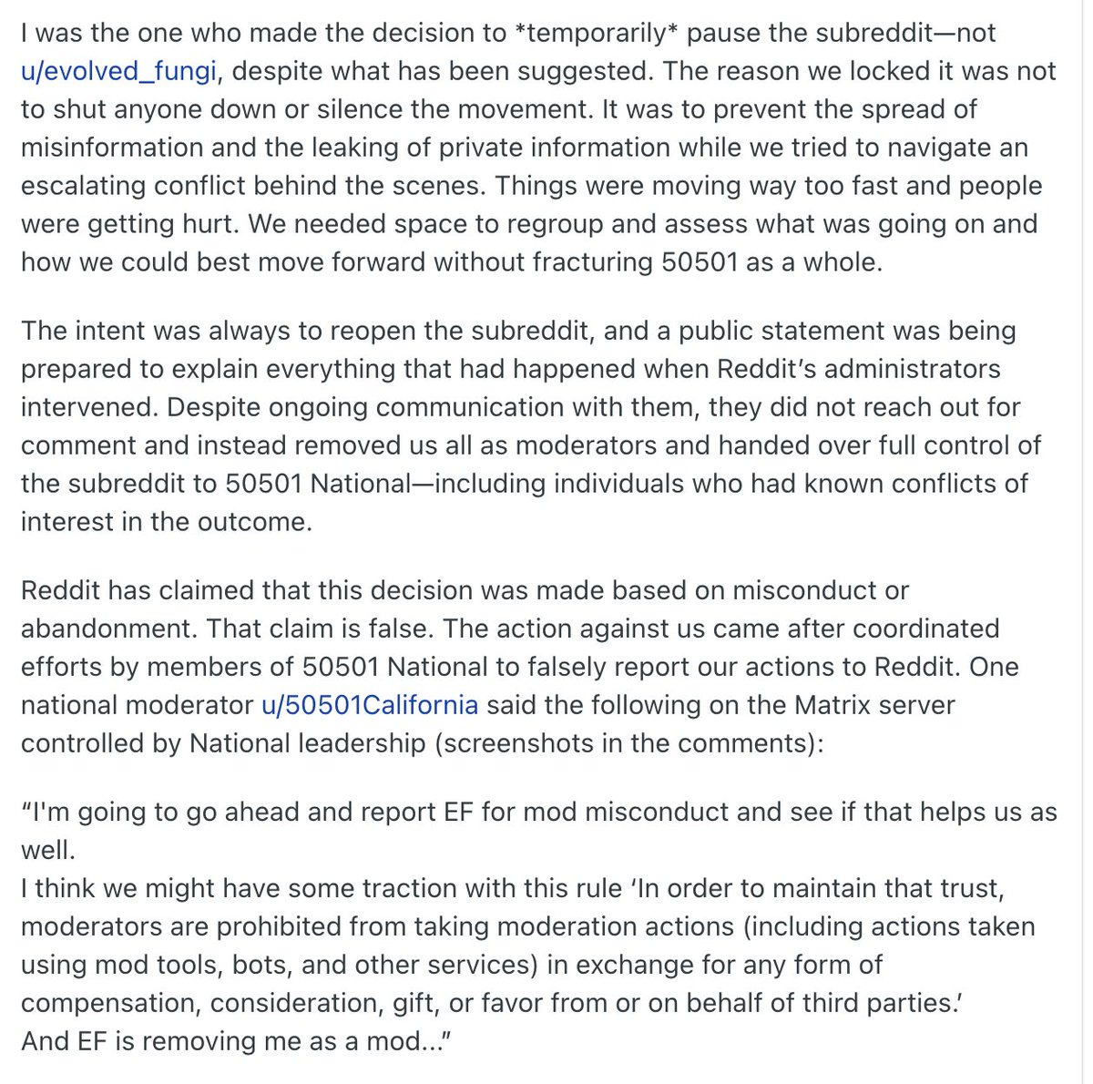 Other moderators report u/Evolved_Fungi for misconduct as a moderator, and he steps down. It is framed as "guy started a movement and got in way over his head and got stressed."