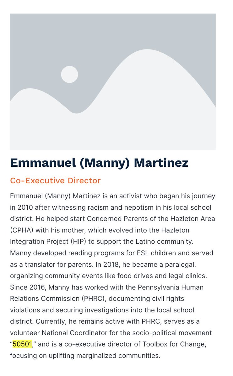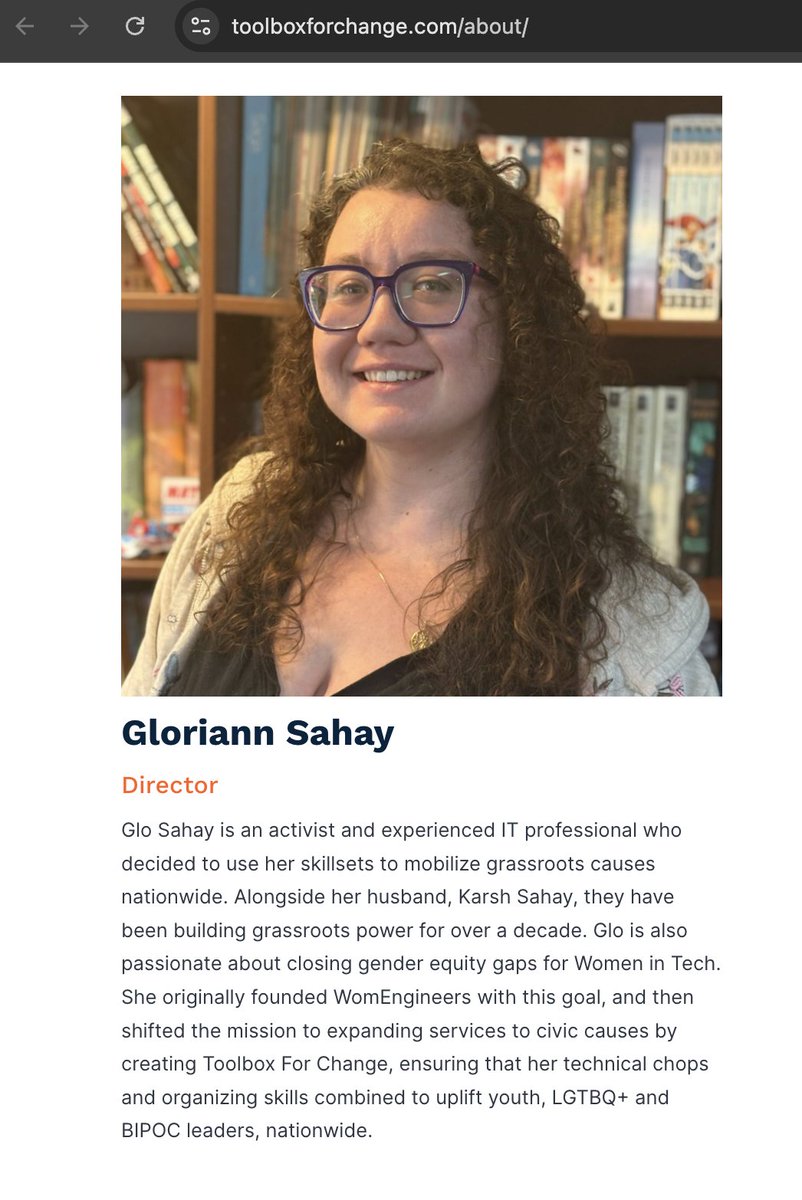 Sahay runs Toolbox for Change, which appears to be the actual operational platform for 50501 and lists 50501 staffers: