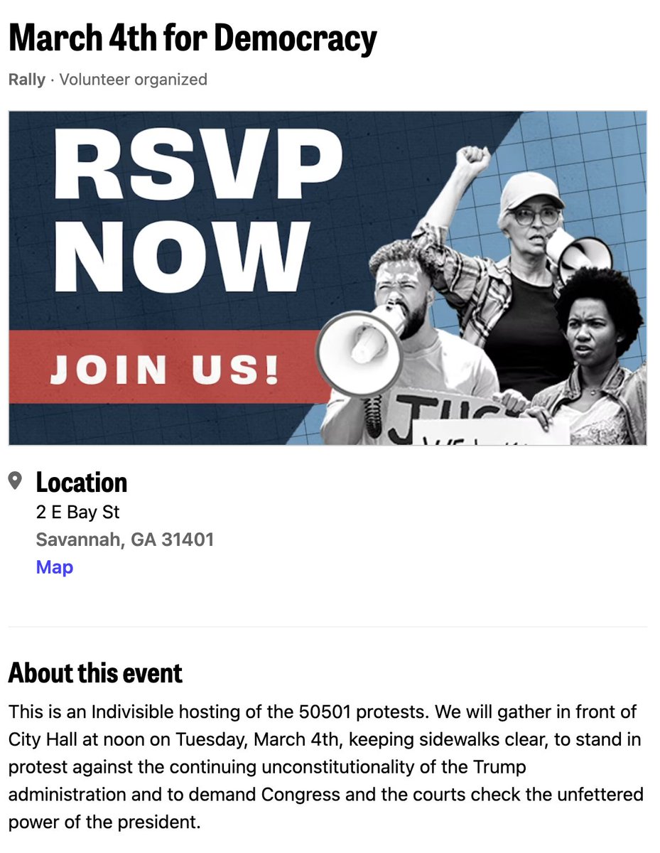 After the original February 5th protests, Indivisible has appeared to completely taken over the 50501 infrastructure. Although a few skeleton people remain - like Toolbox for Change - it seems that Indivisible is the main coordinator now for everything 50501.