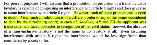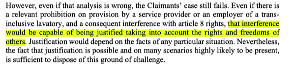 @EHRC But even on that assumption, he concludes that because employers can lawfully provide in addition to single-sex facilities, "trans-inclusive" facilities, there's no interference with those (assumed) article 8 rights.