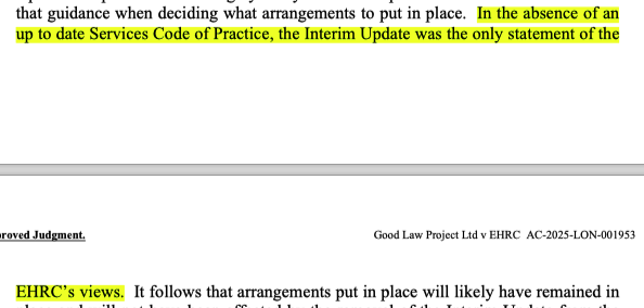 @EHRC "In the absence of an up to date Services Code of Practice" may be read as pointed: the reason there's no up to date CoP is that the Minister for Women and Equalities, Bridget Phillipson, who received it from EHRC on 4 September, still hasn't laid it before parliament.