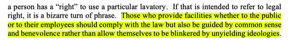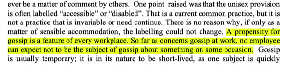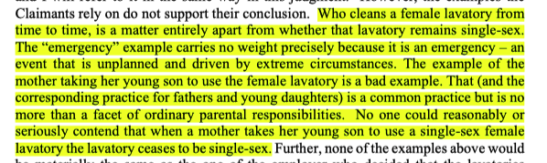 @EHRC The judge is not impressed by the Claimants' arguments about being "singled out" and potentially the subject of speculation or gossip if they are refused the use of opposite-sex facilities and choose not to use the facilities for their own sex: