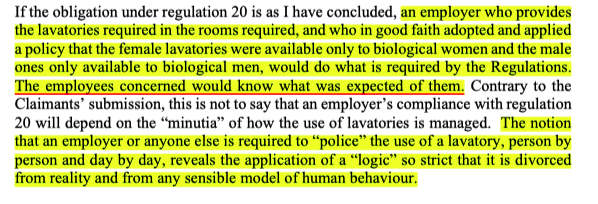 @EHRC The judge is unimpressed by the Claimants' submission that a requirement to provide single-sex facilities could be met by providing separate facilities, but making it clear that people could use whichever facilities they pleased: