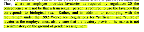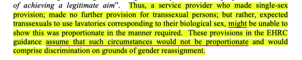 @EHRC Considering the guidance's instruction "do not fail to make provision for transsexual persons", the judge notes that it has assumed that failure to do so would never be justifiable. By implication, that may be going too far.