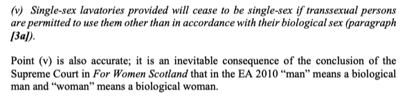 @EHRC The judge notes that the claim that transsexuals may sometimes be permissibly excluded from facilities for their own sex directly reflects the reasoning of the SC in FWS.