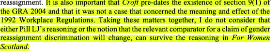 @EHRC ... and that an opposite-sex comparator might be appropriate for a person undergoing "gender reassignment". That didn't find favour:
