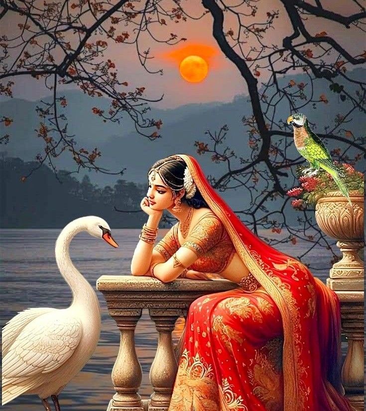 The swan went to Damayanti told her tales Nala’s beauty and valour. She had heard praises of Nala from her maids and the common folk previously.
