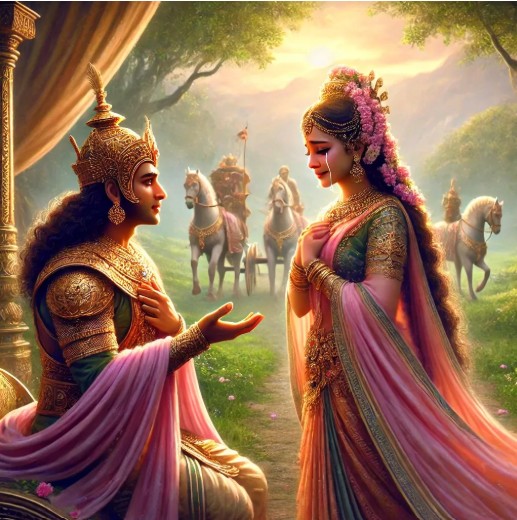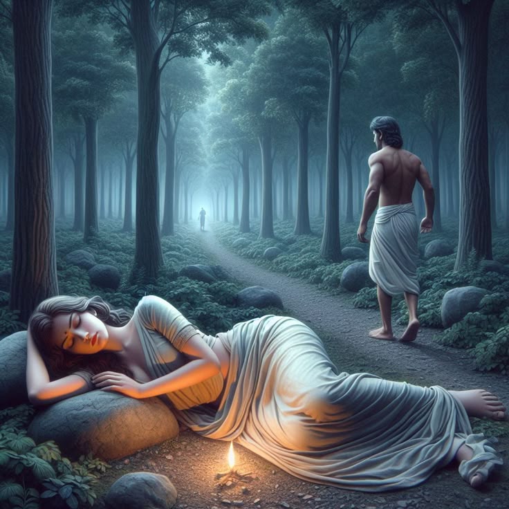 In exile and despair, believing he was protecting her from his own downfall, he left Damayanti sleeping in the forest.