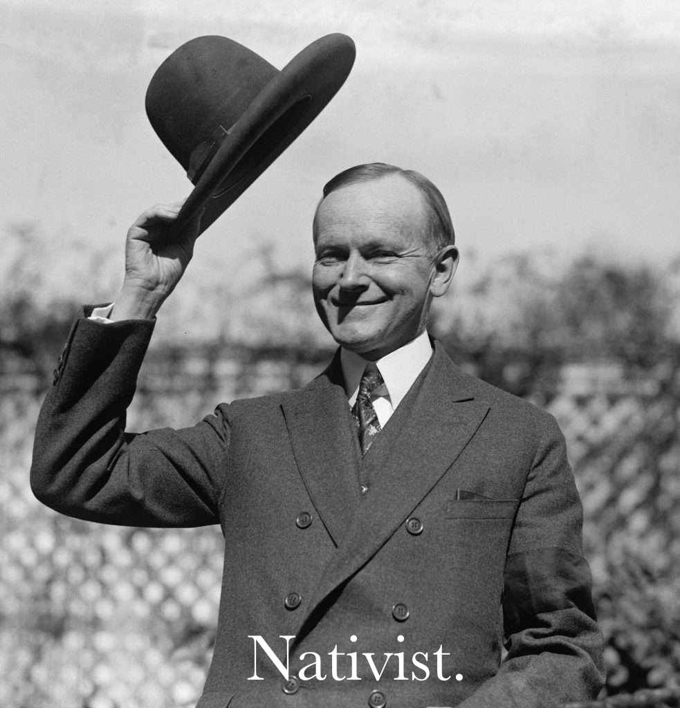 Calvin Coolidge, conservative icon of small government and low taxes, signed the Immigration Act of 1924, saying restriction ‘seeks to shield our wage earners from the disastrous competition of a great influx of foreign peoples. This saves the American job for American workmen.