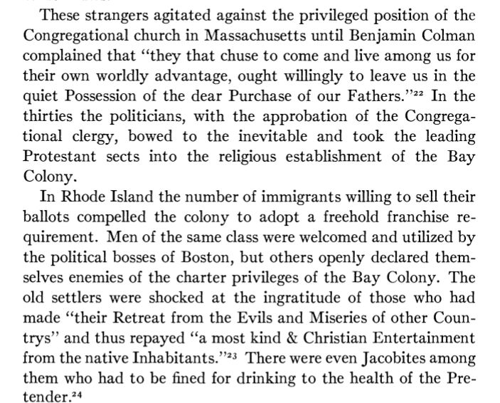 And what did the new immigrants do? Sure, they did the labor Puritan boys didn't want to do. And lots of other things along with it. Drinking, murder, property crime, beating their wives. All things mostly unknown to the idyllic sealed off community of 130IQ Anglos before.