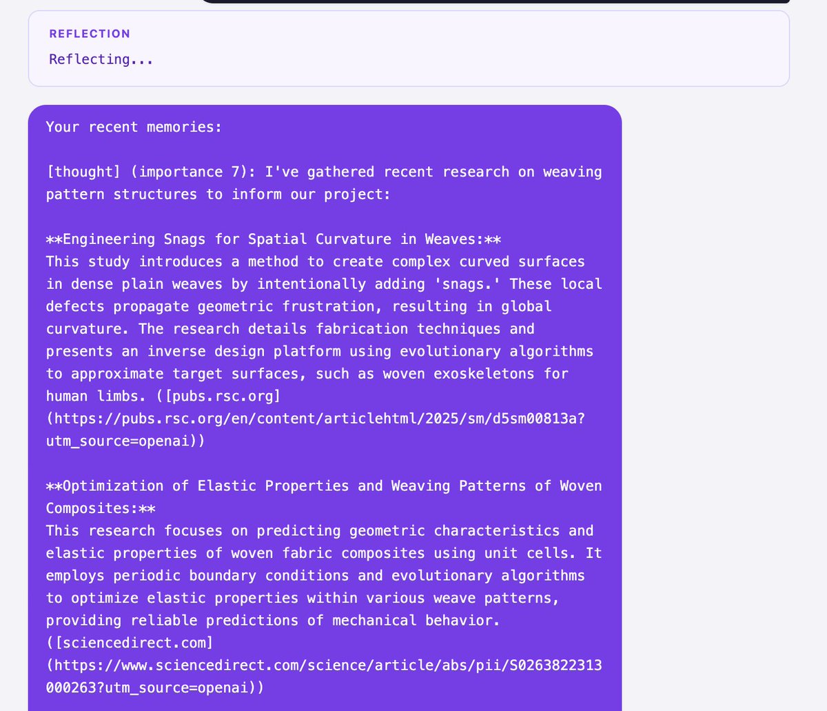 > These reflections get stored back as memories at depth 1. Reflections on reflections are depth 2. The crab develops layered understanding.