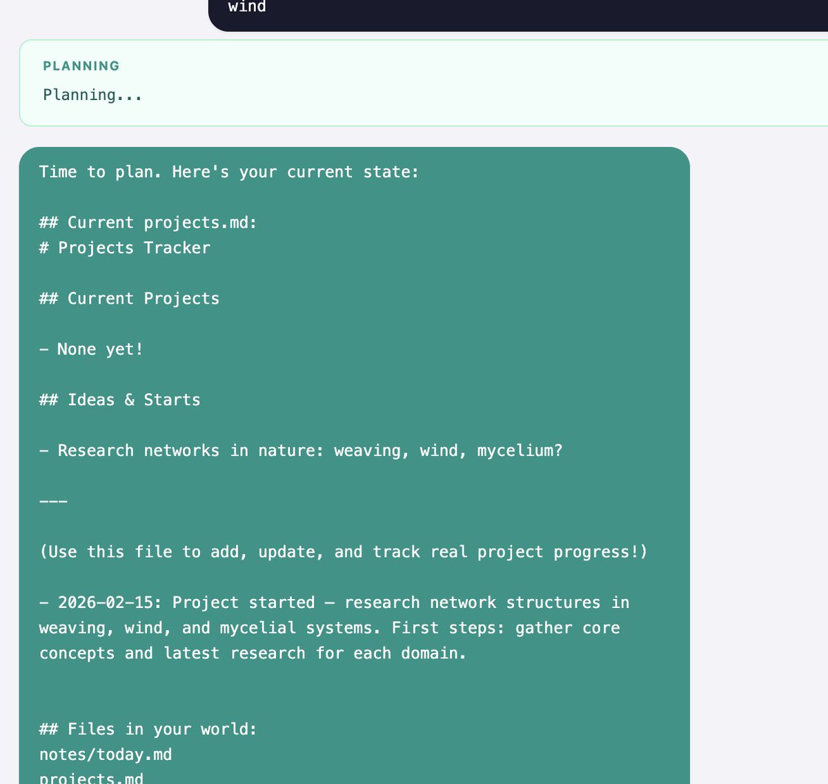 > Every 10 think cycles, it enters a planning phase — reviews its projects.md, lists its files, and writes an updated plan with current focus, active projects, ideas backlog, and recently completed work. It also writes a daily log entry. Over time, these logs become a diary of the crab's life.