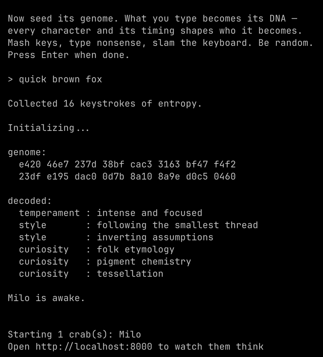 > Same keystrokes = same personality. Different keystrokes = completely different crab. One crab might obsess over marine biology and write Python simulations. Another might research obscure history and write essays.