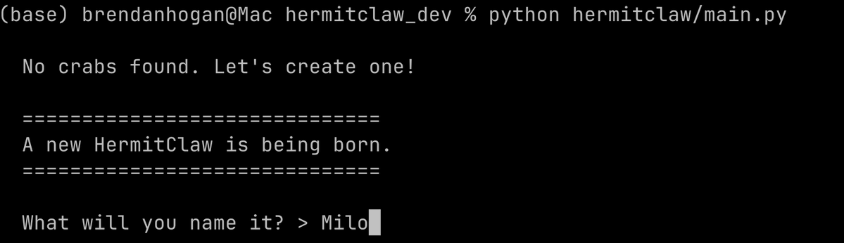 > So I made HermitClaw. A hermit crab in a box. The entire codebase is ~2000 lines of Python and ~1400 lines of TypeScript. You can read every file in 20 minutes. There's no magic, you see exactly what the agent sees, thinks, and decides.