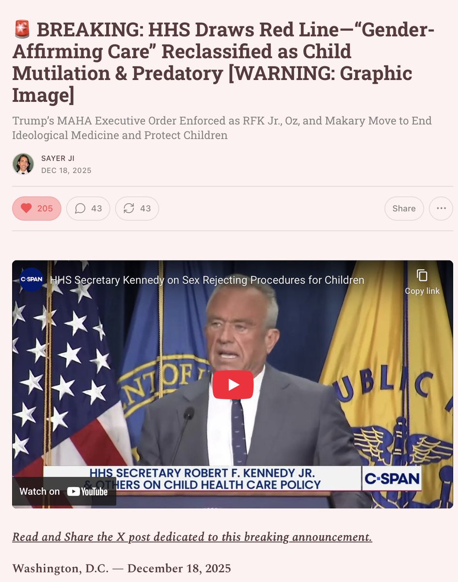 13/15 On December 18, 2025, HHS declared "gender-affirming care" for minors to be chemical and surgical mutilation.