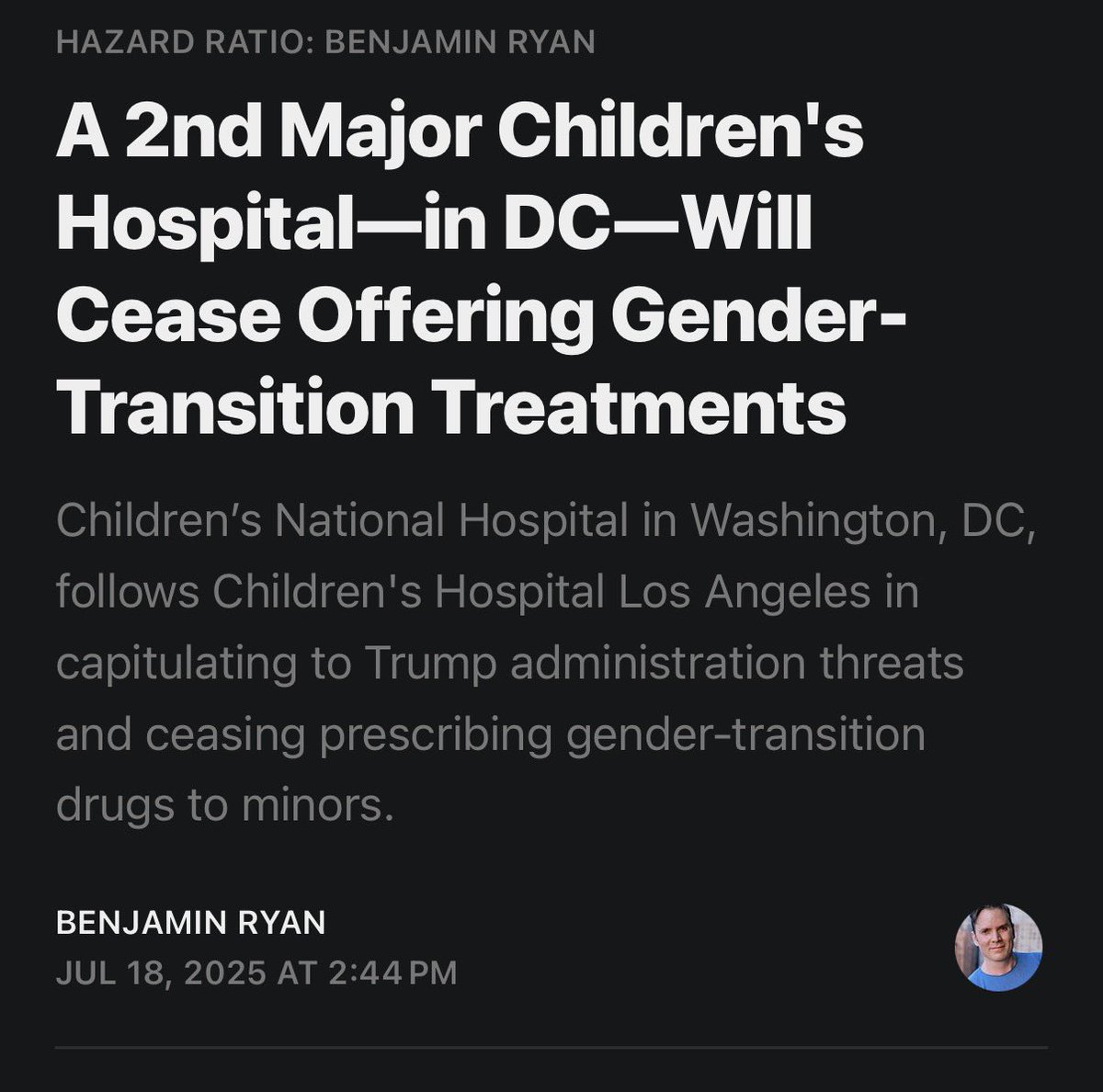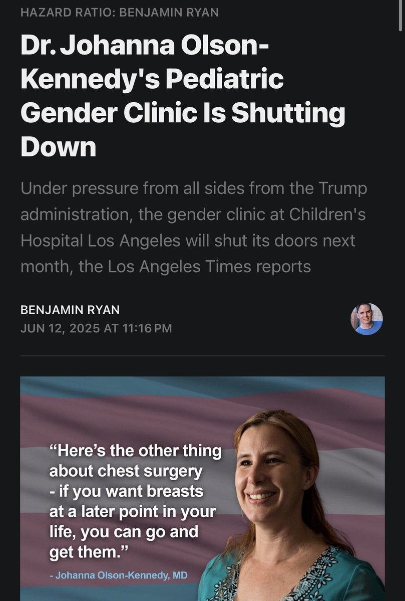 Children’s Hospital Los Angeles was the first to shut down its pediatric gender clinic in the face of the Trump administration’s threats, last July. Since then, dominoes have kept falling. open.substack.com/pub/benryan/p/…