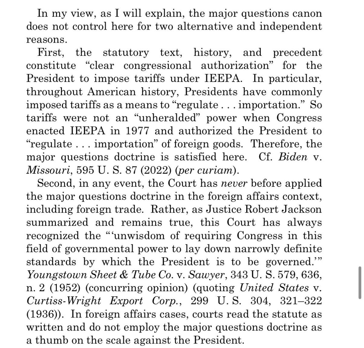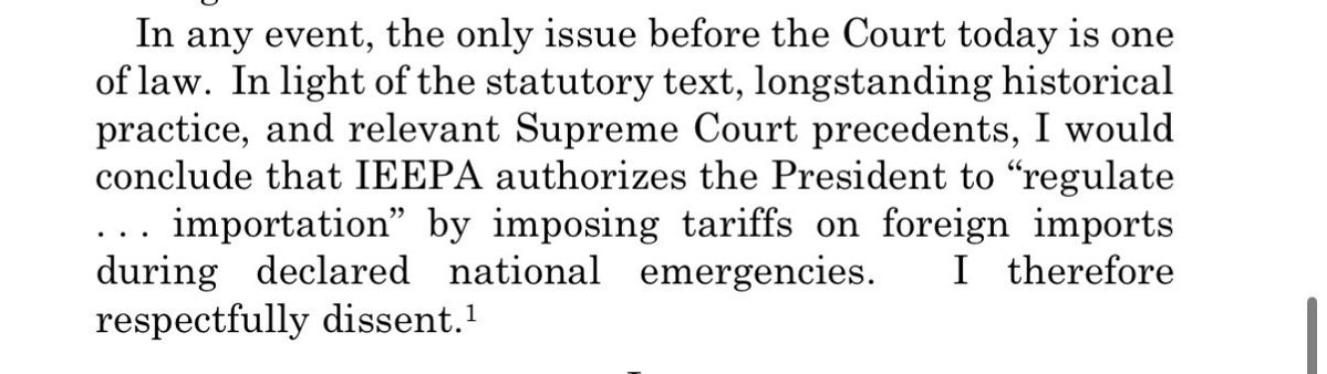 2/ Kavanaugh disagrees w/the court’s ruling that Trump lacks the power to impose tariffs under IEEPA’s “regulate importation” language. Says all signs (history, precedent, etc.) point towards the opposite conclusion.