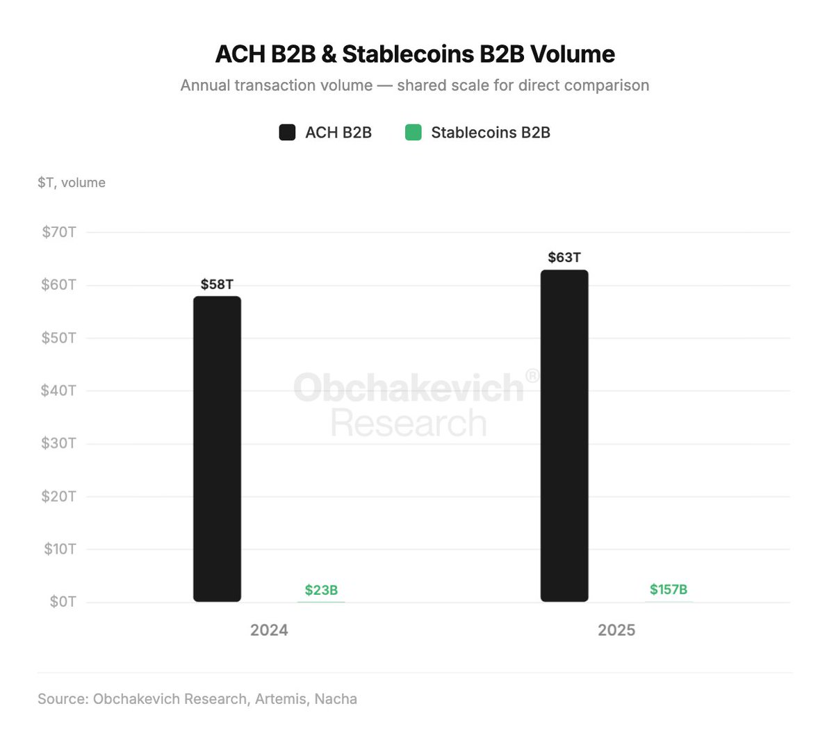 2024 showed a striking contrast: ACH B2B processed $58T in transactions, while B2B stablecoins processed only $23B.