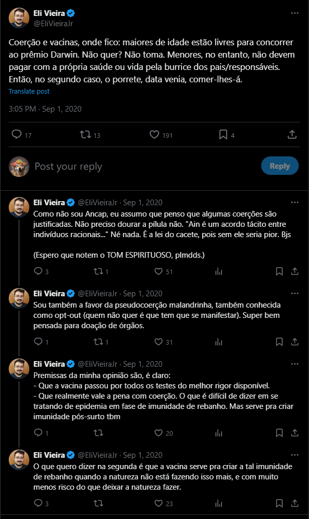 Enquanto isso, influenciadores menores ridicularizavam quem divulgava a verdade. Eli Vieira, um dos influencers que promovia a Astrazeneca 2 anos depois d ela ser suspensa na Europa, decidiu me honrar c/um processo quando mostrei q ele defendeu uma vacina q ele próprio não tomou.