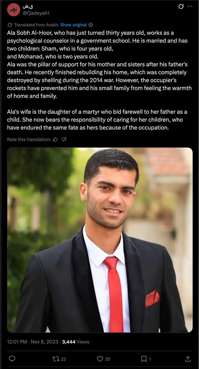 Alaa Sobh Hamouda al-Hour (ID#: 803500826, age 31), a commander in PIJ’s Financial Administration Unit, was also a psychological counselor at the government-run Muin Bseiso elementary school in Khan Younis. al-Hour was killed in an October 2023, airstrike.
