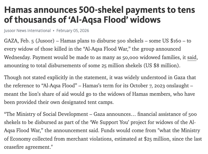Last week, the Hamas-run Ministry of Social Development (MOSD) announced a program ("We are your support") to provide NIS 500 (~$160) to widows of Gazans killed in the war. Funding for this program is allegedly money confiscated from merchants for "criminal" activities post-ceasefire.