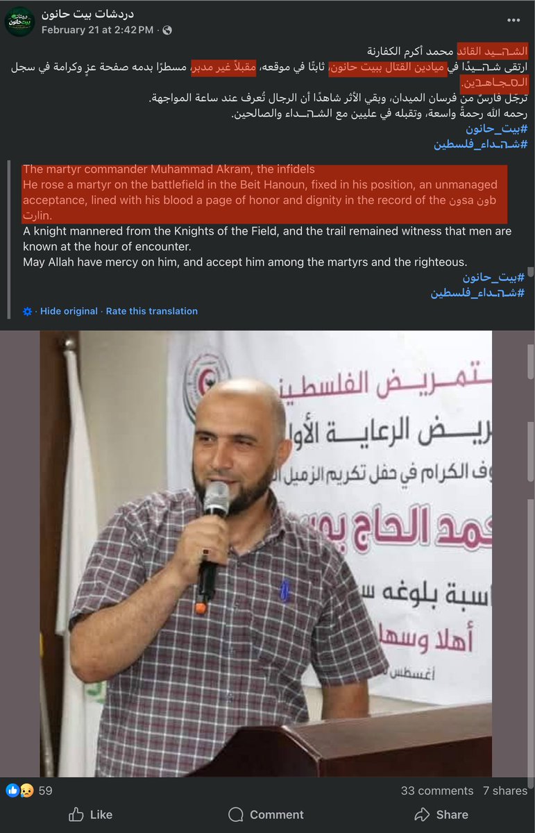Memorial posts refer to al-Kafarna as a “mujahid” and sometimes as a commander. al-Kafarna is not listed in the Nov 2025 Gaza Health Ministry death toll list. Since he died in an inaccessible area of Beit Hanoun and is unlikely to have arrived at a hospital, this implies that either his family has not yet reported his death or the Health Ministry has not yet processed it.