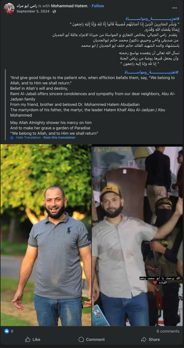 Fadi Jihad Mohammed al-Wadiyya (ID# 802854323, age 33) , a physiotherapist working for Doctors Without Borders, was ID'd by the IDF as a PIJ member shortly after he was killed in a June 2024 airstrike. Today, PIJ confirmed that al-Wadiyya was the deputy head of their military manufacturing unit.