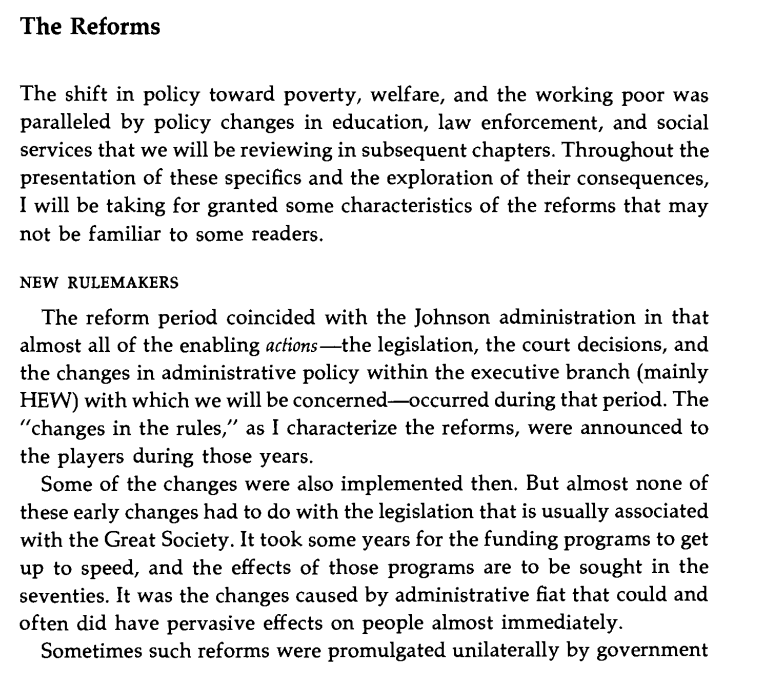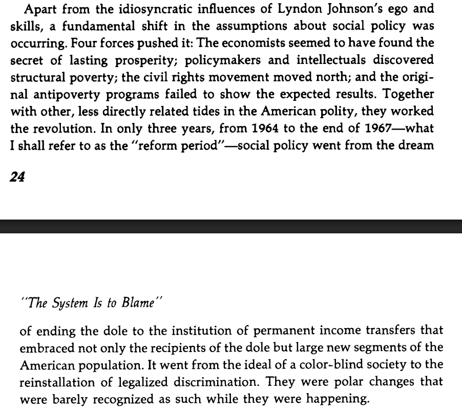 Thread with excerpts from Charles Murray's "Losing Ground" (1984), a book on the failure of US welfare and social policy 1950-1980 to achieve its goals. Image