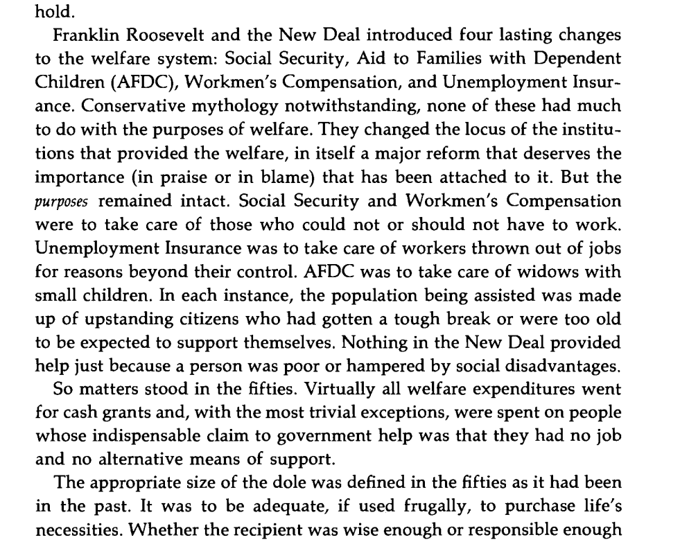 Until 1957, Americans assumed welfare was to prevent the deserving poor (eg elderly, cripples, widows with children) from starving and was intrinsically morally damaging. The New Deal did not change this; it merely changed who was paying to the government. Image