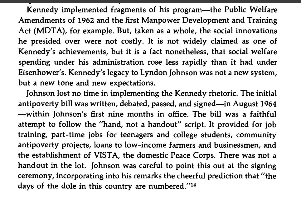Kennedy himself changed little, but Johnson inherited his moral assumptions and was a far more effective legislator. Both the modern welfare system and the shift from colorblindness to racial privileges occurred 1964-1967. Image